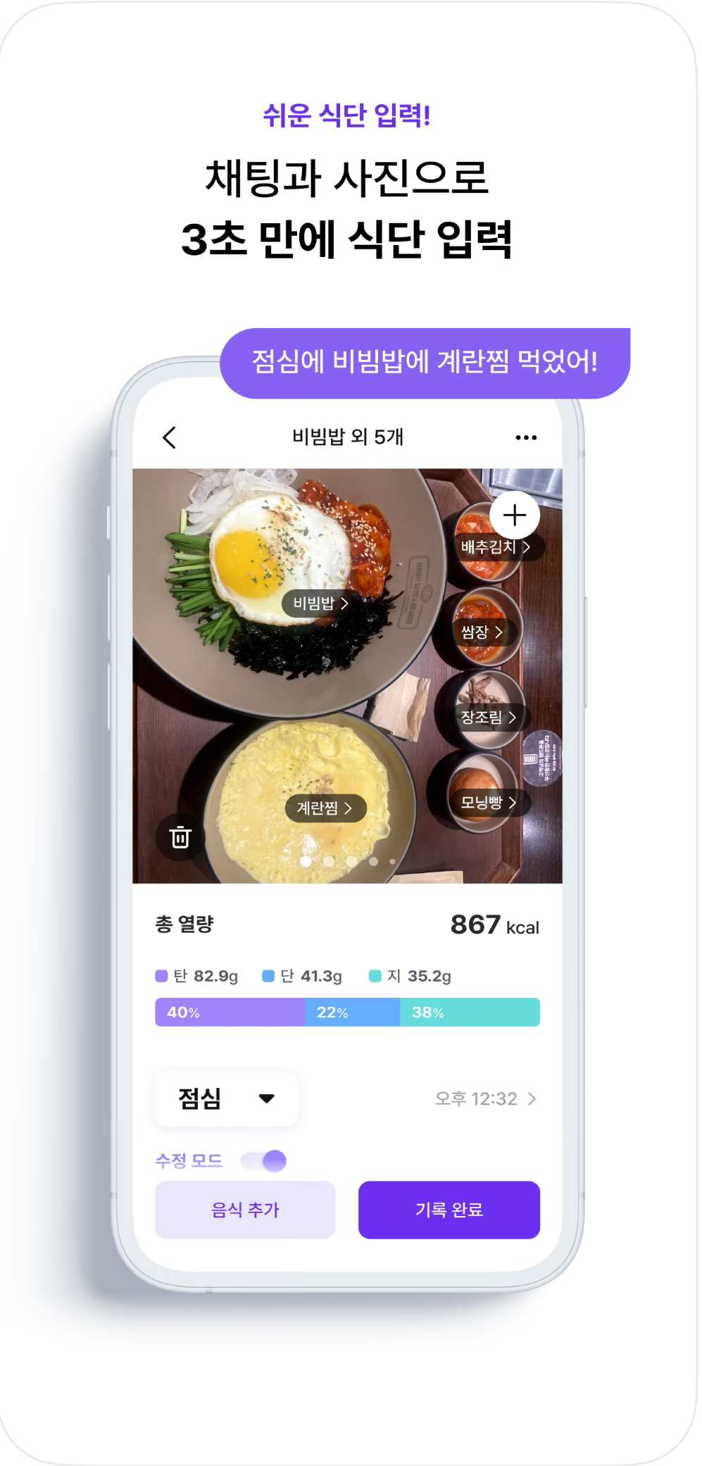 칼로리 계산 외에도 단백질, 탄수화물, 지방 비율을 한눈에 파악할 수 있어 건강 식단 관리에 최적화되어 있습니다.